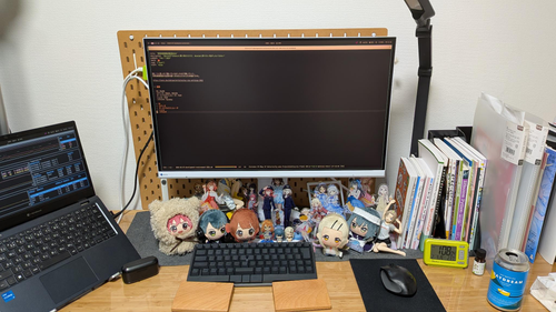 アキヨドで買った。デカいのと解像度が高いので作業がしやすくて助かっている。長時間見ても目の疲れがたまりづらいのも良い。 ディスプレイの下にアクスタとフィギュアを置いていて、ディスプレイが邪魔になりつつあるのでモニターアームを買いたいところ。